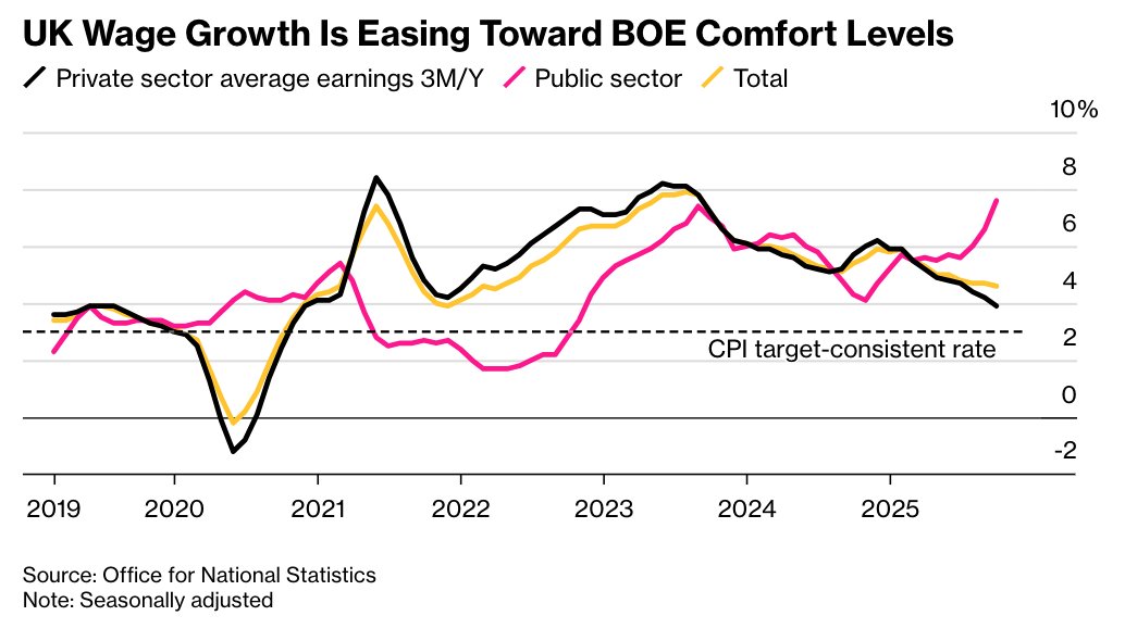 RSM UK首席经济学家托马斯·普表示:“失业率再次上升,加之私营部门薪资增长放缓以及通胀即将大幅减速,都为英国央行周四降息奠定了基础。但近期就业增长的部分疲软很可能源于预算案引发的市场混乱。”