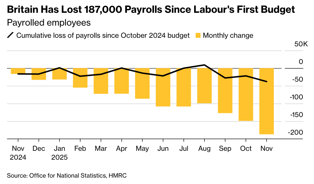 在里夫斯在其首份预算案中提高了企业用工成本后,英国劳动力市场在今年走软。虽然上月公布的预算案避免了重蹈大幅增税的覆辙,但企业仍面临明年最低工资上调以及就业权利强化的前景。英国国家统计局经济统计主任利兹·麦基翁表示:“整体形势继续显示劳动力市场正在走弱。在册雇员人数再次下降,反映出招聘活动低迷,而企业告诉我们近期岗位数量有所减少。”